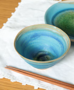 ターコイズブルーのお茶碗が、さりげなく食卓を華やかにしてくれて
