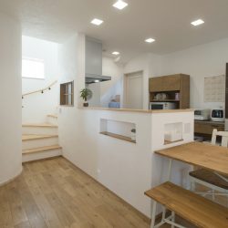 - 漆喰壁に無垢オークの床。階段~玄関を通る家族を見守れるように設けたコンロ前の造作窓がお部屋のアクセントに。
