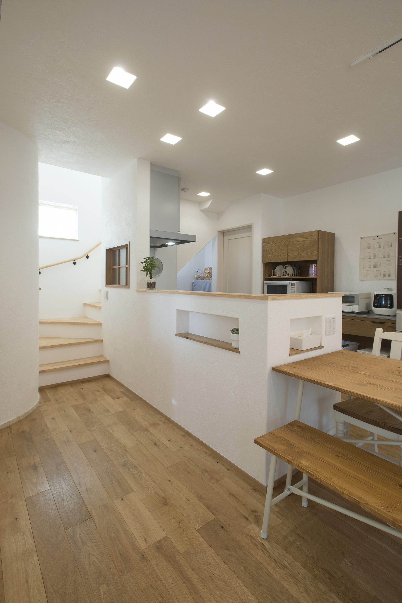 - 漆喰壁に無垢オークの床。階段~玄関を通る家族を見守れるように設けたコンロ前の造作窓がお部屋のアクセントに。