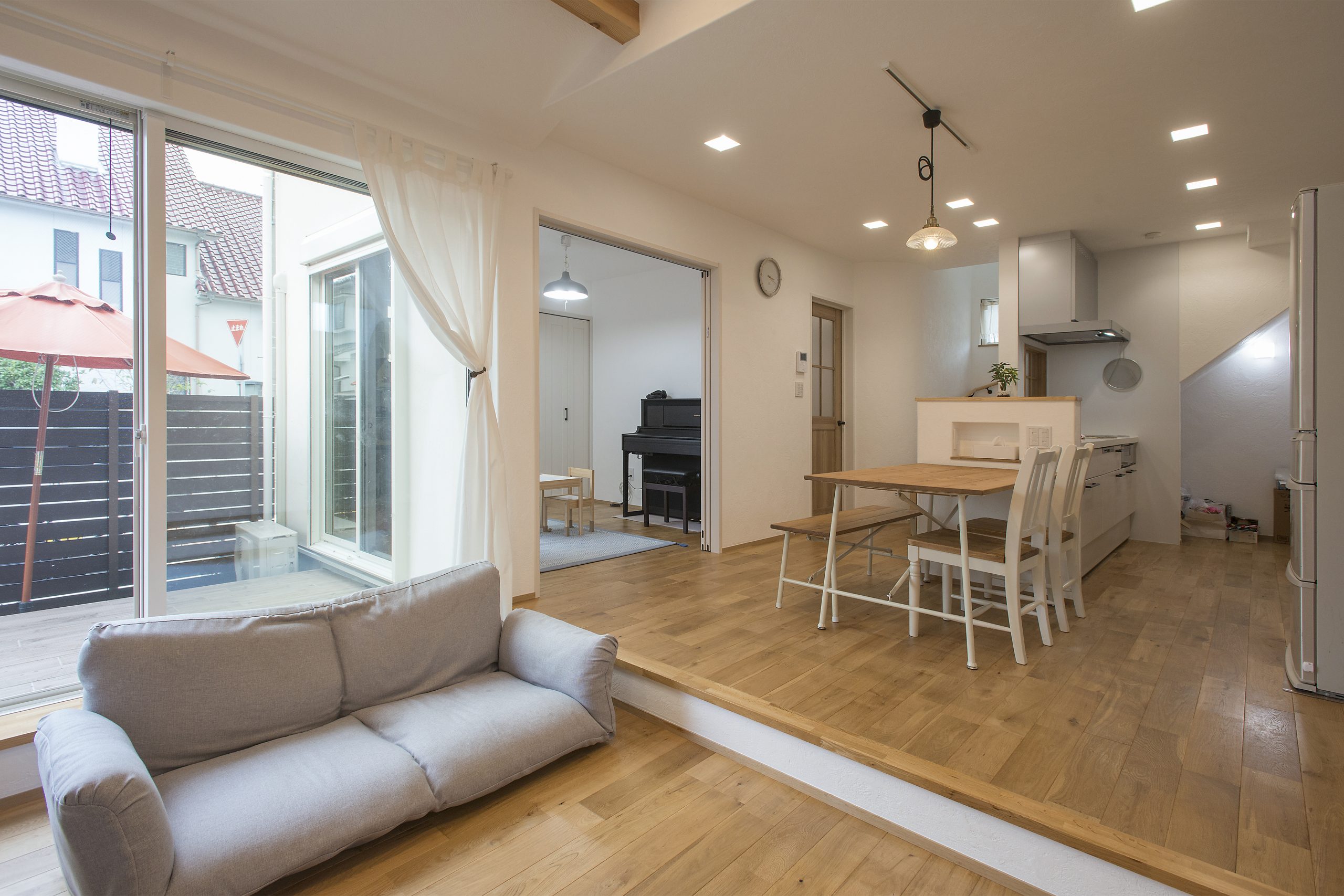 - 段差を設けたリビングは、どこでも腰掛けられるスペースになり、家具のレイアウトによって色々な楽しみ方ができます。