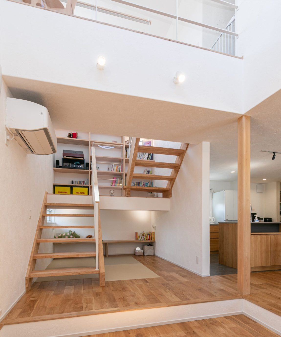 - 階段とライブラリーを暮らしの中心にできるようにデザイン。家族が思い思いの時間を過ごしつつ、互いの気配を感じられる。