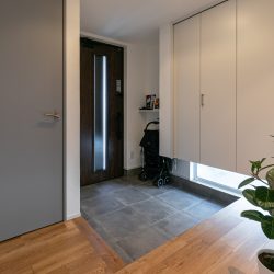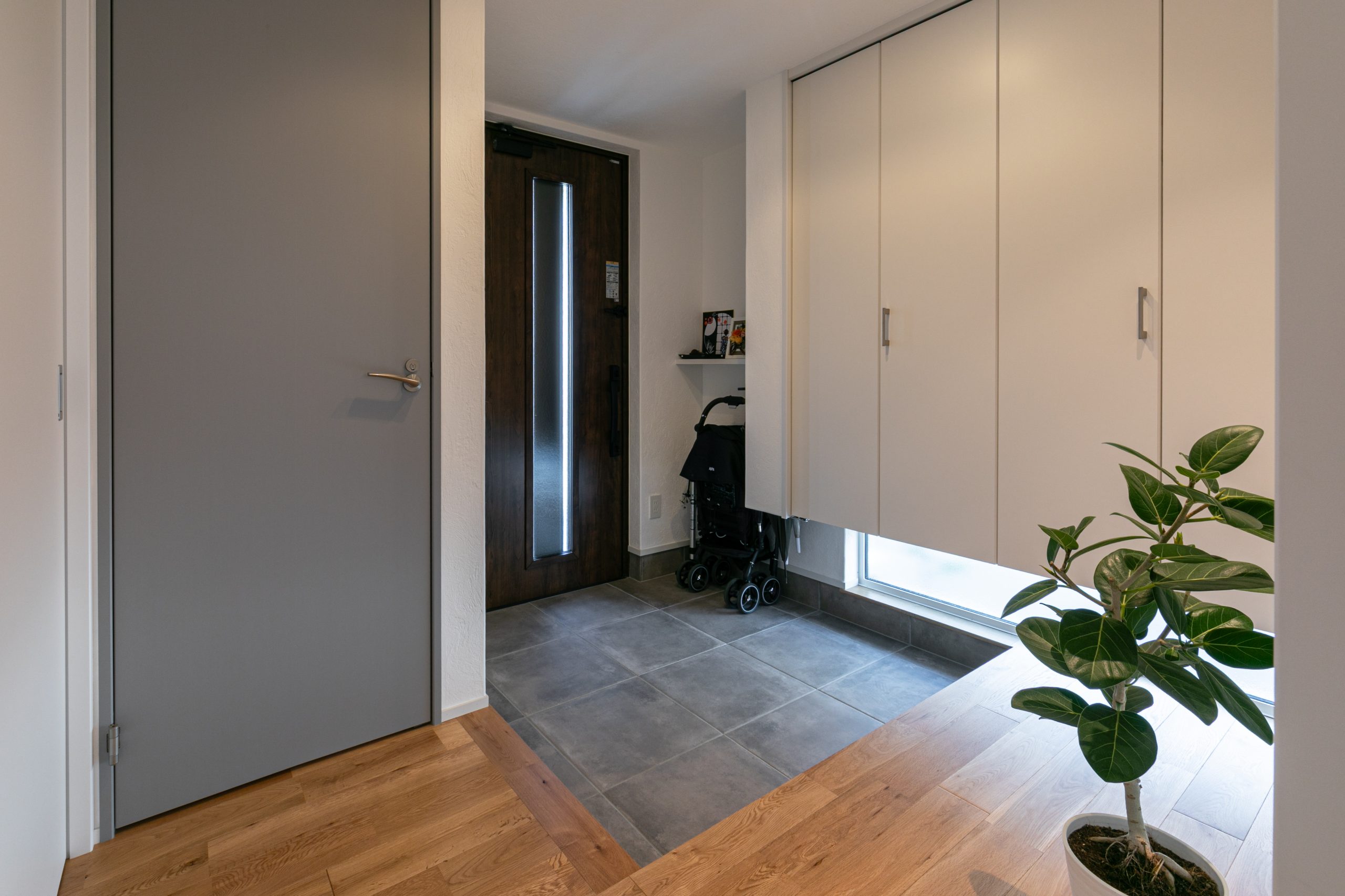 - 足元から光を取り込む玄関ホール。大容量の吊収納を設置してスッキリと。