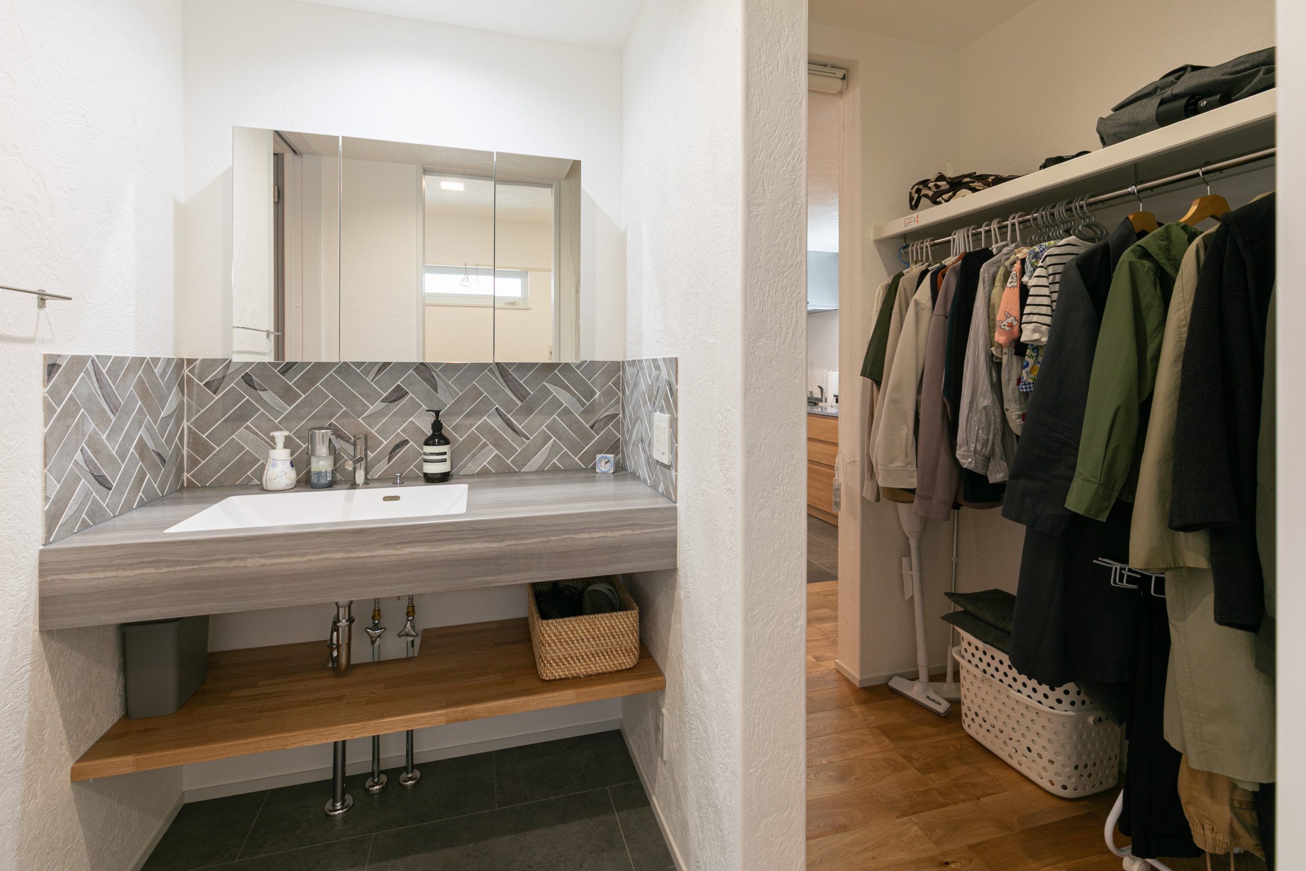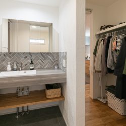 - 水廻りとファミリークロークを玄関横にまとめて配置。回遊動線にもなっておりリビングからの移動もスムーズ。