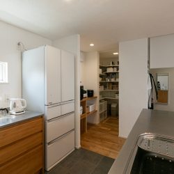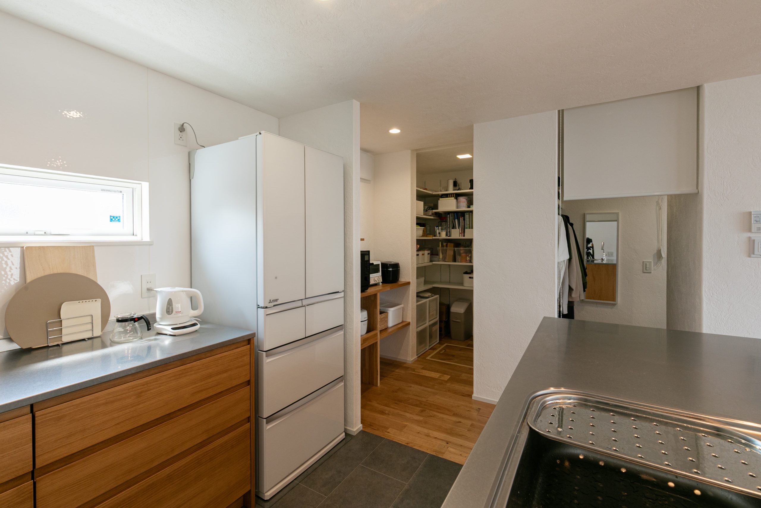 - キッチンから奥まった位置にパントリーを設置。キッチンからの動線は確保しつつ、リビングダイニングからの視覚は遮る工夫。