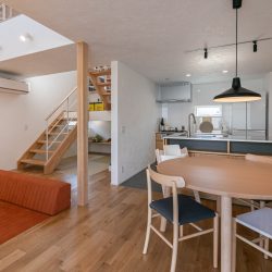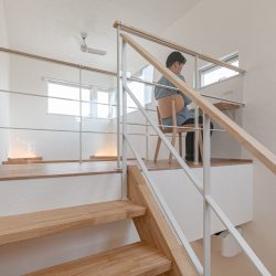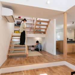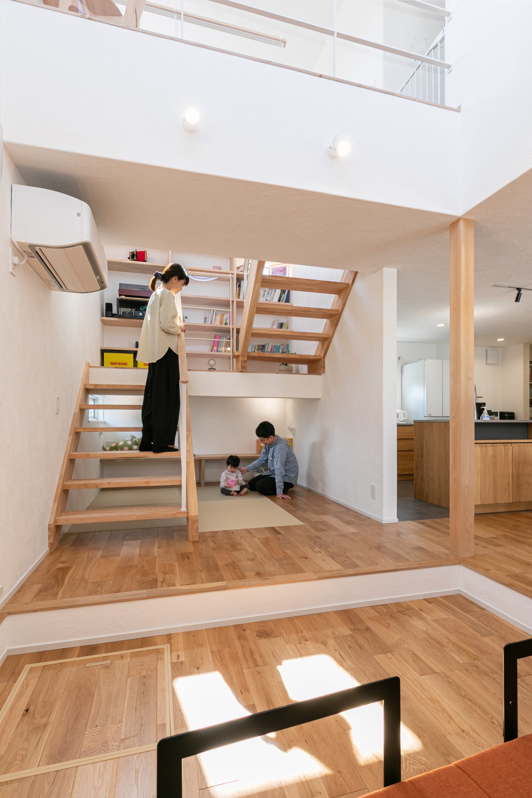 - 階段とライブラリーを暮らしの中心にできるようにデザイン。家族が思い思いの時間を過ごしつつ、互いの気配を感じられる。