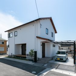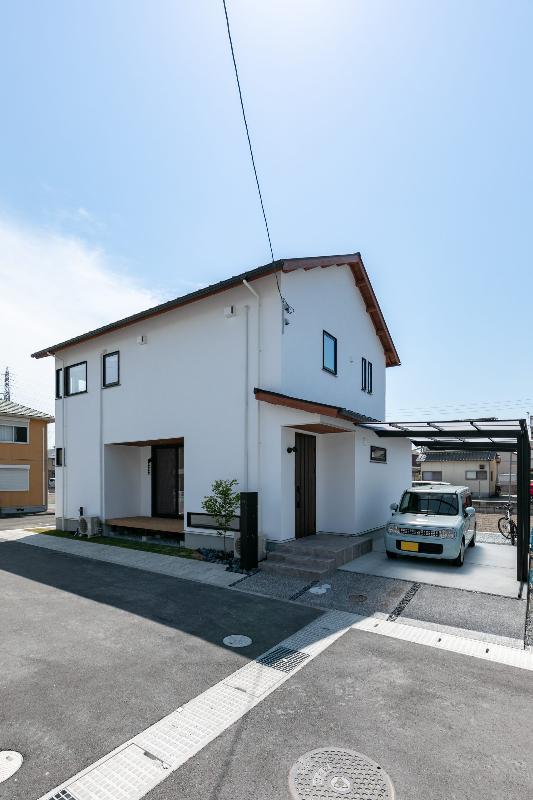 - お家の中心にダイニング続きのウッドデッキを設置。壁の漆喰が映えるスッキリとした外観デザインに。